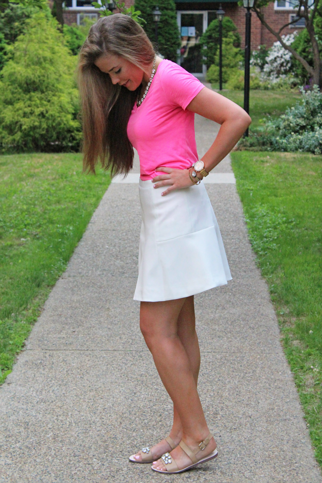 How was everyone’s weekend? Mine was spent in Maine celebrating my little sister’s high school graduation. This time of year, our schedules are so crazy! From engagement parties, graduations, to weddings, we have a lot of outfits to be picking out, girls. I wanted to share an outfit idea that can be worn many different ways. This JCrew skater skirt can be kept business casual with a simple v neck tee, or dressed up with a blouse. I’m in love with the material of this skirt because it maintains structure and isn’t flowy. The white is so versatile, but there are lots of options – prints, neons, pink, and black. This skirt is a great piece to mix and match for all your events this summer.
