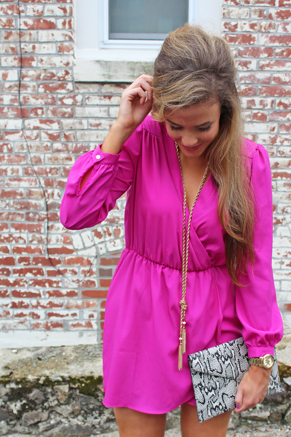 The great thing about a solid colored dress if you can really let your personality shine through with your accessories! I paired my magenta wrap dress with the nude BP heel to keep everything neutral so I could go a little wild with this snakeskin clutch. I am usually a leopard girl, but instantly fell in love with this Rebecca Minkoff snakeskin print (swoon). Pick an item of focus [like a printed clutch or floral heels] and keep the other outfit pieces neutral.